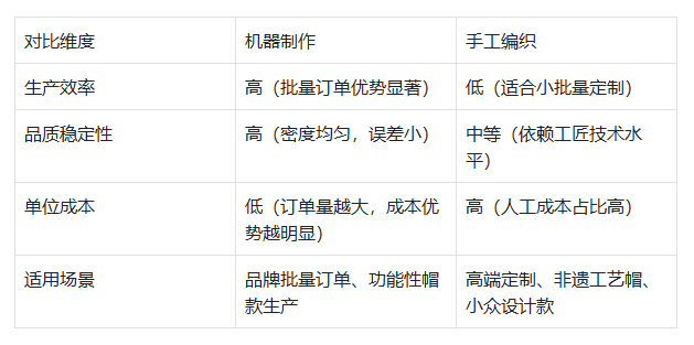 對(duì)帽業(yè)企業(yè)而言,機(jī)器制作與手工編織并非對(duì)立關(guān)系,而是適配不同需求的工藝選擇,具體差異可參考下表:?